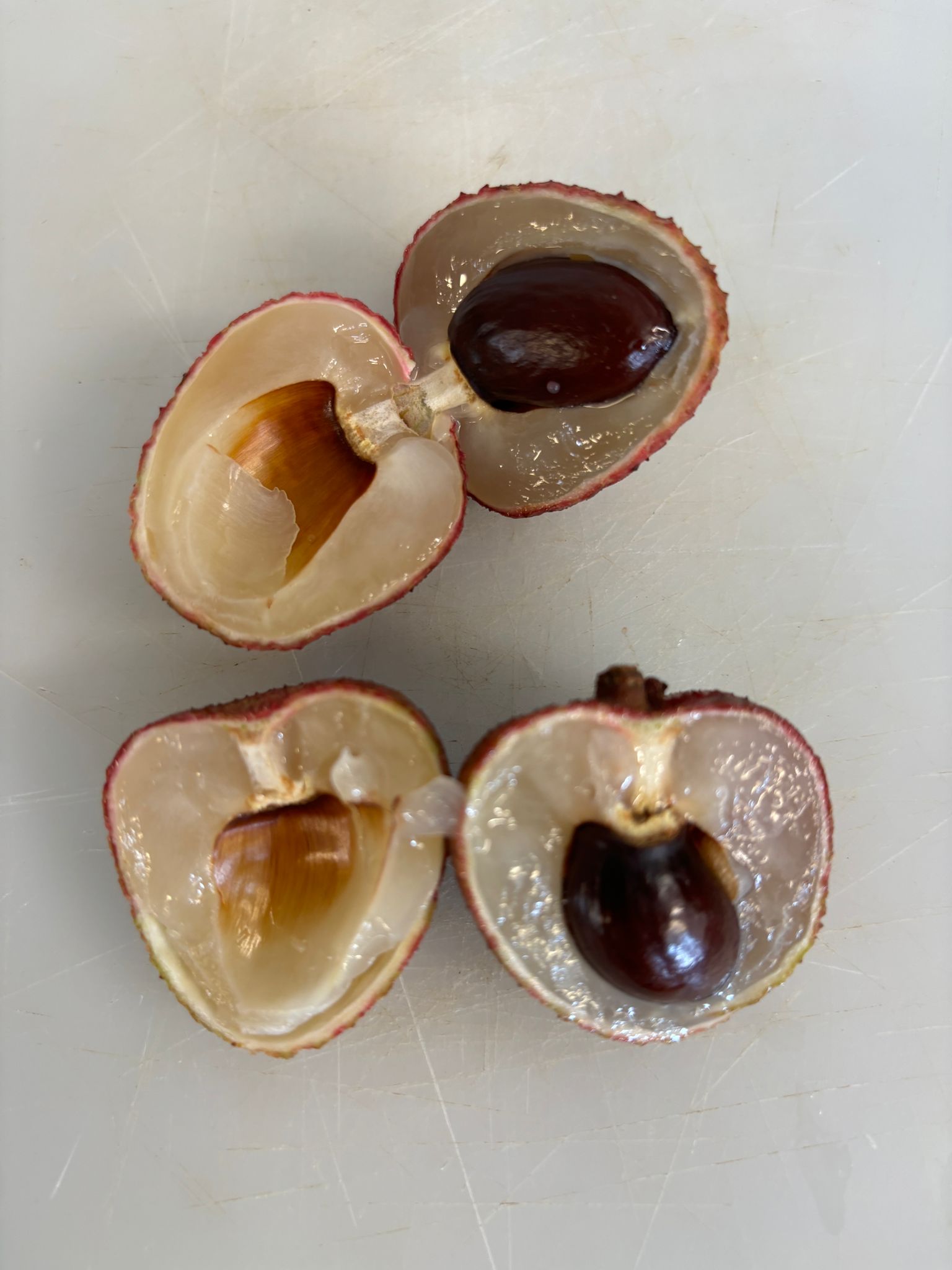 The lychee (Litchi chinensis) is a subtropical fruit. It is oval to round in shape and about the size of a walnut. Its thin, red bumpy skin is easily peeled to reveal a white, juicy, translucent ball of firm jelly-like flesh that surrounds a shiny brown seed.
